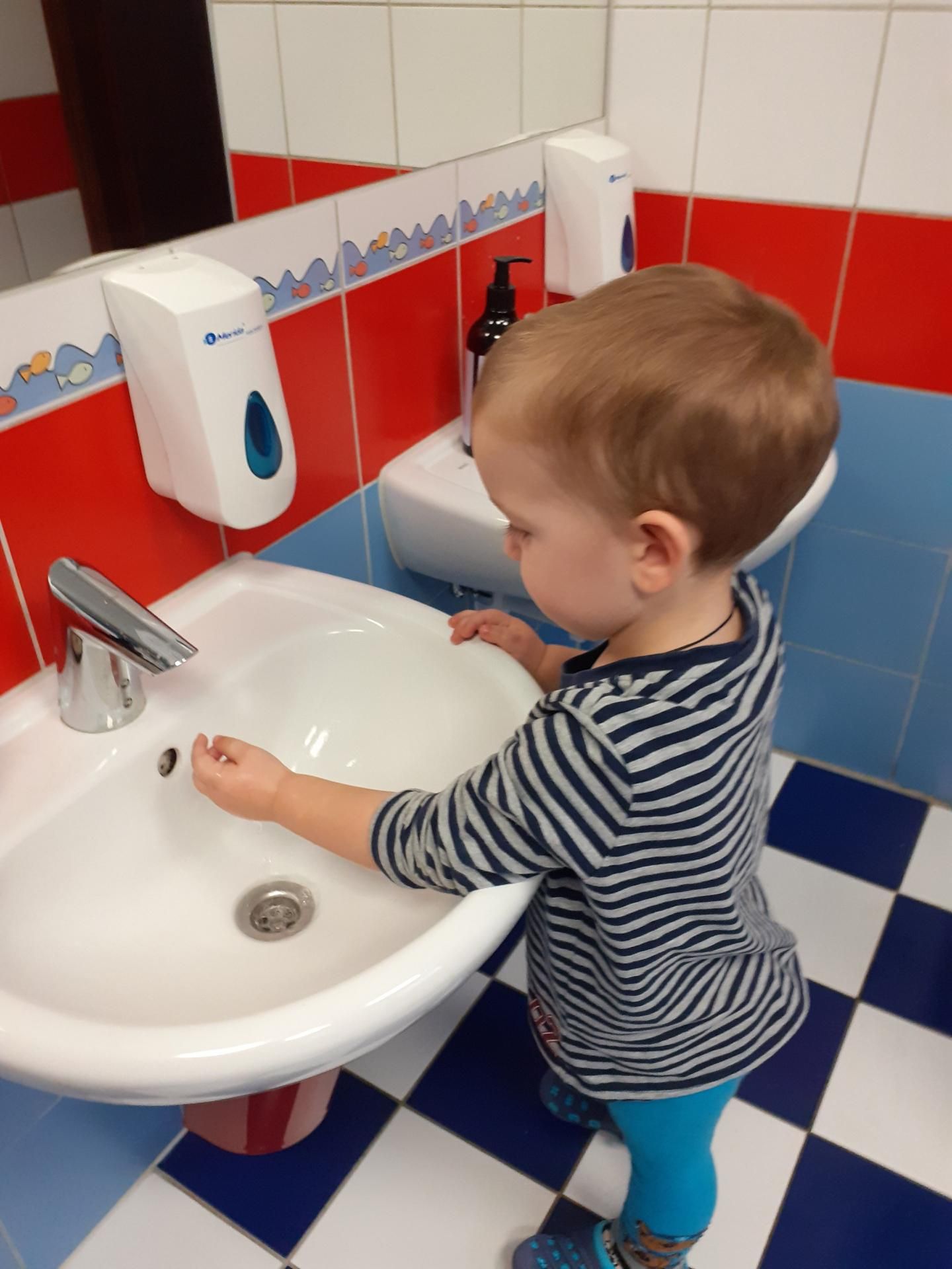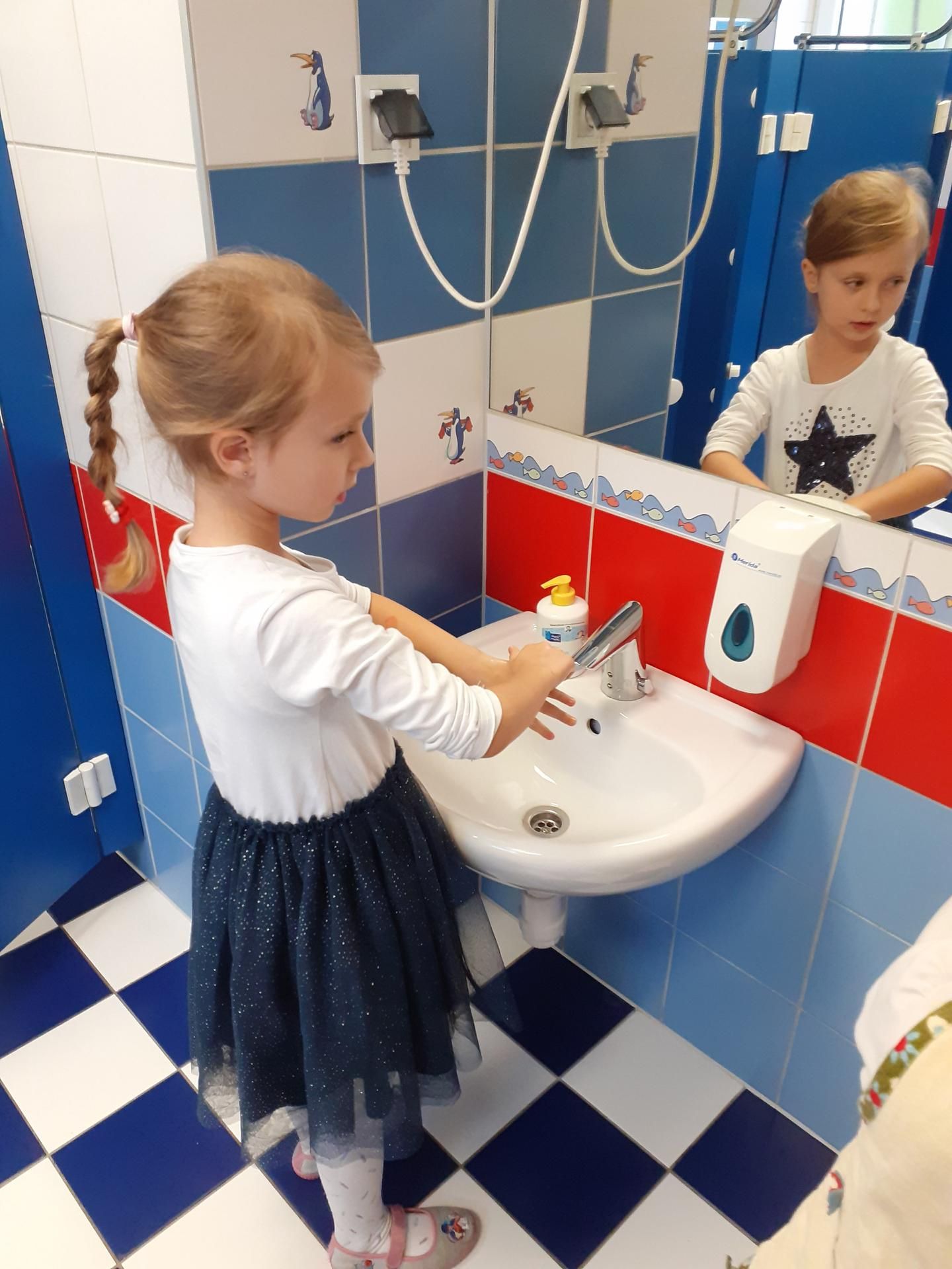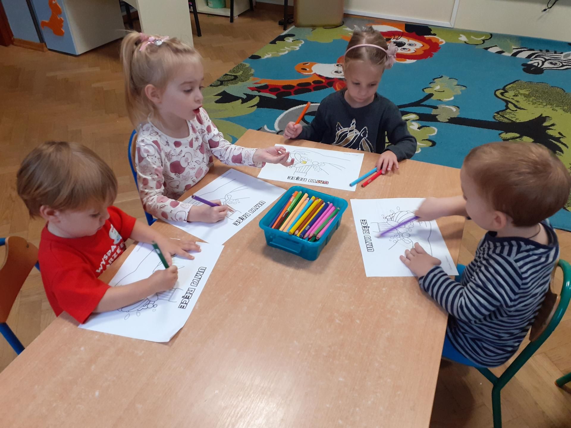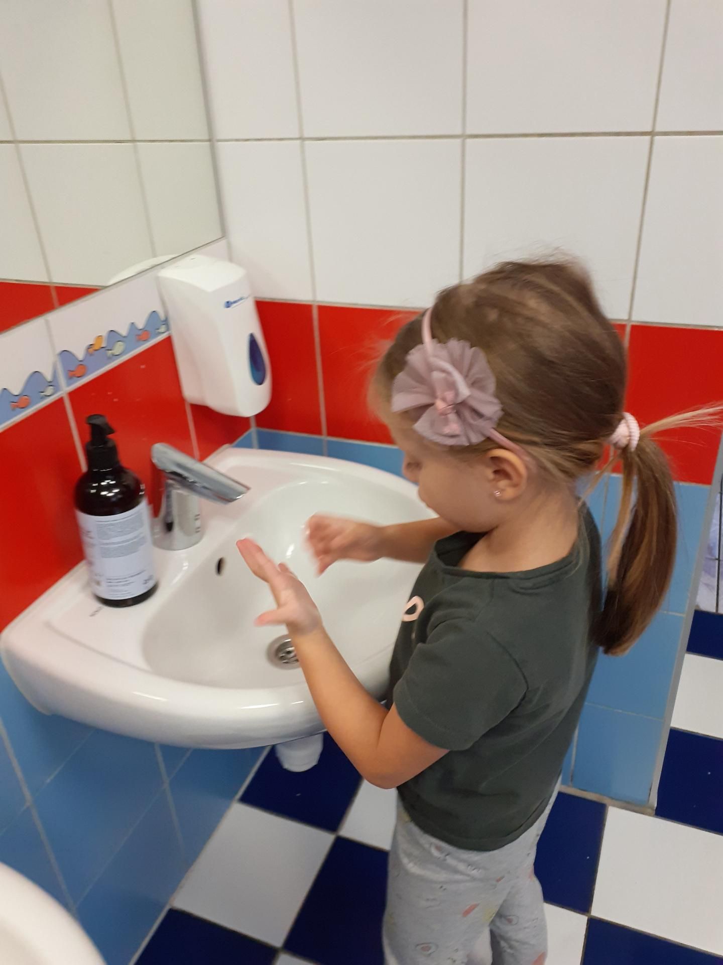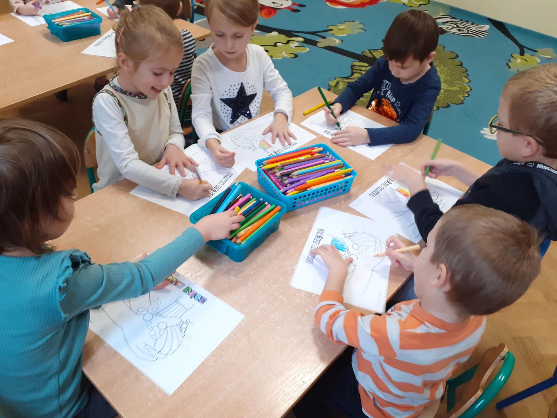 Dzisiaj Przedszkolaki obchodziły Światowy Dzień Mycia Rąk. Z tej okazji odbyły się rozmowy na temat zarazków, bakterii i wirusów, które dostają się do naszego organizmu poprzez brudne ręce. Dzieci dowiedziały się, jakie znaczenie dla zdrowia ma czyste i dokładne mycie rąk. Omówiliśmy także schemat mycia rąk oraz zastosowaliśmy go w praktyce. Na koniec dzieci pokolorowały kolorowanki.